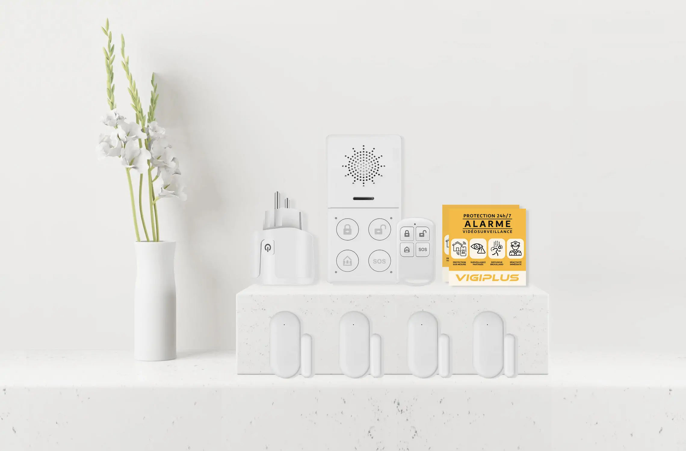 Pour renforcer l’effet dissuasif, le système intègre un simulateur de présence : une prise connectée qui permet d’allumer automatiquement une lampe ou un appareil électrique, simulant une présence humaine lors de vos absences.