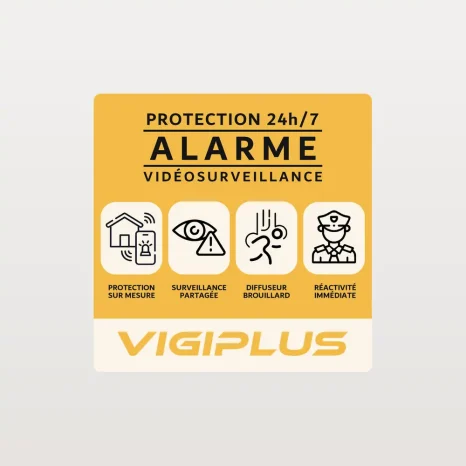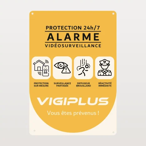 La plaque métallique dissuasive VIGIPLUS signale clairement la présence d’un système de sécurité nouvelle génération, réduisant ainsi le risque d’intrusion avant même toute tentative.