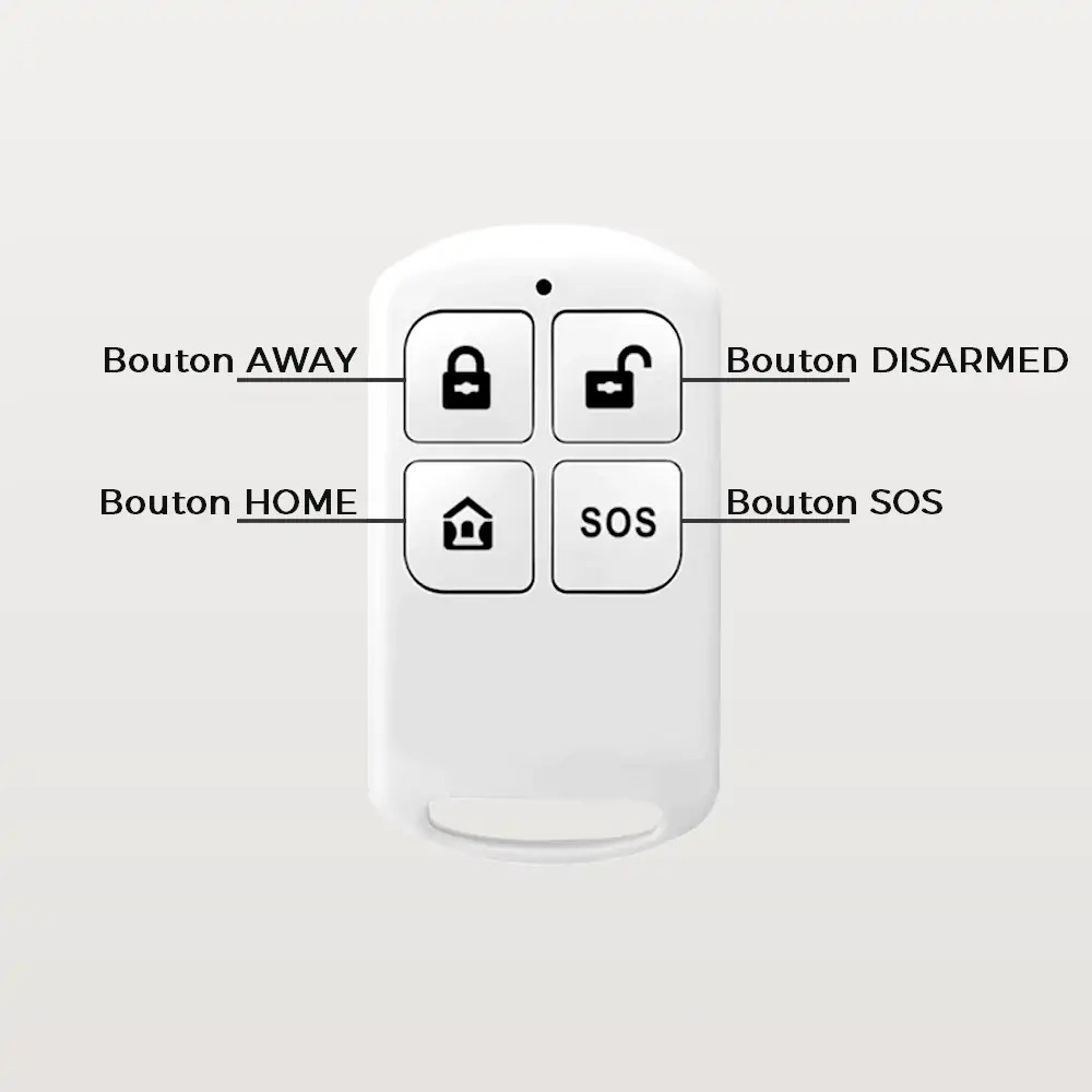 • Bouton AWAY (Absent) : Active l’alarme avec tous les détecteurs connectés – idéal lorsque vous quittez votre domicile